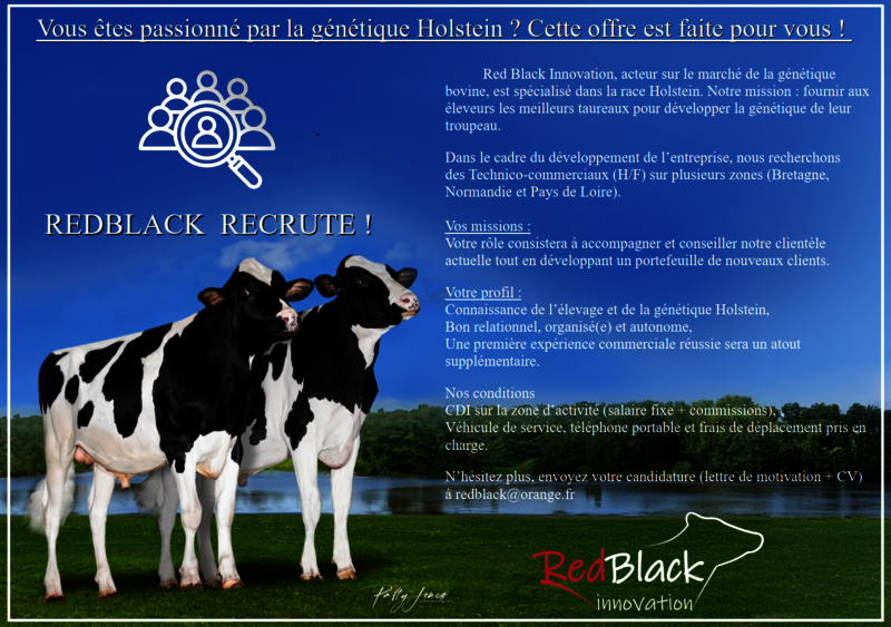 Red Black Innovation, acteur sur le marché de la génétique bovine, est spécialisé dans la race Holstein. Notre mission : fournir aux éleveurs les meilleurs taureaux pour développer la génétique de leur troupeau.