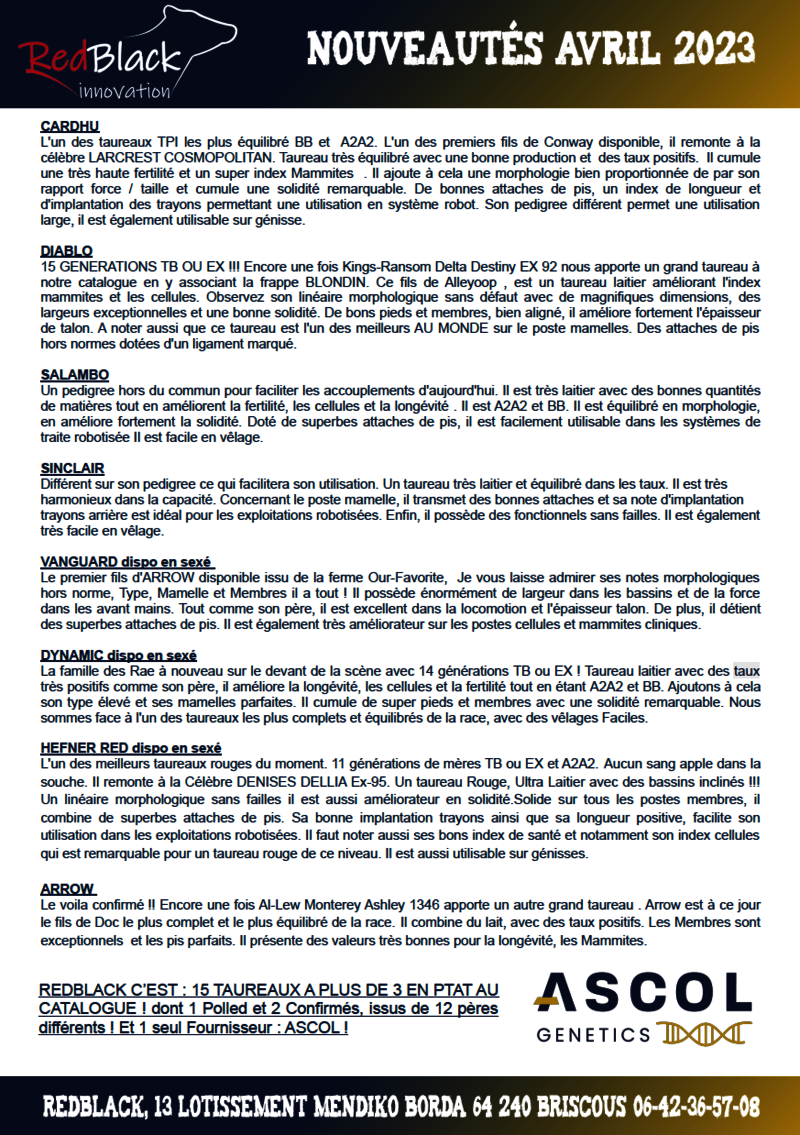 L'un des meilleurs taureaux rouges du moment. 11 générations de mères TB ou EX et A2A2. Aucun sang apple dans la souche. Il remonte à la Célèbre DENISES DELLIA Ex-95. Un taureau Rouge, Ultra Laitier avec des bassins inclinés !!! Un linéaire morphologique sans failles il est aussi améliorateur en solidité.Solide sur tous les postes membres, il combine de superbes attaches de pis. Sa bonne implantation trayons ainsi que sa longueur positive, facilite son utilisation dans les exploitations robotisées. Il faut noter aussi ses bons index de santé et notamment son index cellules qui est remarquable pour un taureau rouge de ce niveau. Il est aussi utilisable sur génisses.